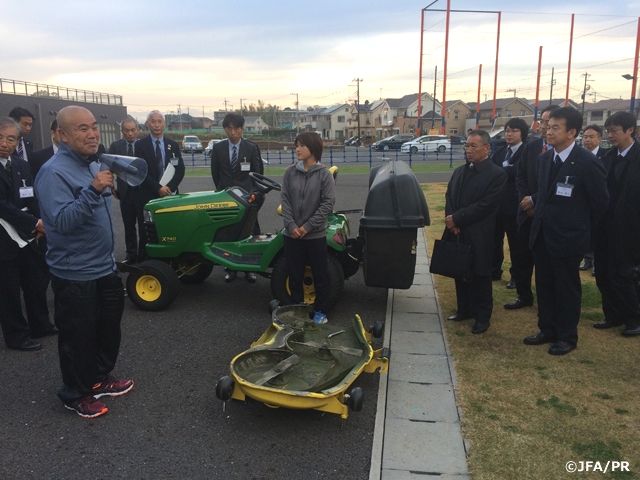 JFAハウスで行われた講義では、サッカーの普及における施設整備推進の重要性や、グラウンドの維持管理、整備スキームに関する様々な事例が紹介されました。その後、大宮アルディージャ練習場では、実際のグラウンド・クラブハウスの視察も行われました。「家」をコンセプトに作られたクラブハウスは、選手、サポーター、地域住民、スタッフすべての利用者の居心地と利便性を追求した素晴らしい施設となっていました。天然芝のグラウンドも、プロクラブの利用を前提とし、そのための高度な維持管理を実現する必要な設備が機能的に配置されている様子を見学しました。また、自治体やクラブが地域とともに歩む取り組みについても紹介されました。