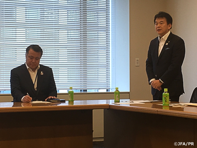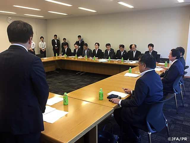 要望書は、サッカーグラウンドやスタジアムの整備、女子サッカーや障がい者を含めたグラスルーツサッカーの環境整備などの項目からなるもので、出席した総務省、文科省、スポーツ庁、経産省、国交省の各代表者に手渡されました。