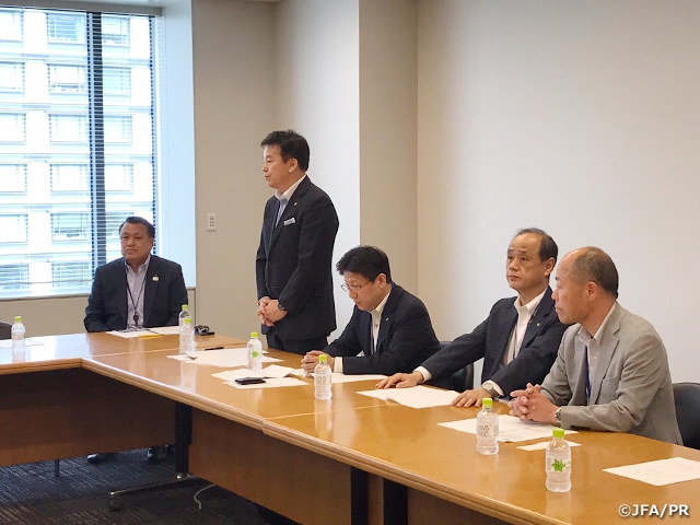 要望書は、サッカーグラウンドやスタジアムの整備、女子サッカーや障がい者を含めたグラスルーツサッカーの環境整備、多くの関係者が参加しやすい学校部活動環境の整備などの項目からなるもので、出席した総務省、スポーツ庁、経産省、国交省の各代表者に手渡されました。