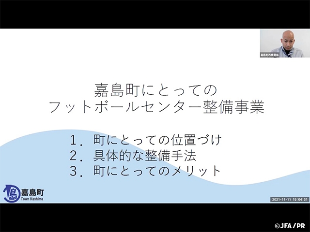 本研修会は、本来であれば施設見学と試合観戦に合わせ実施しておりましたが、コロナ禍もあり、初めてのオンラインでの開催となりました。このような中、多くの自治体の方々にご参加いただき厚く感謝申し上げます。本研修では、熊本県サッカー協会、嘉島町の方々から民間活力を活用した施設整備の事例をご紹介いただきましたが、あらためて施設整備の重要性について再認識したところであります。これからも、本研修会を有意義なものにしていけるよう頑張ってまいります。