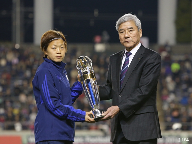 3月4日(金)、キンチョウスタジアムにてAFCアニュアルアワード2015の表彰式が行われました。なでしこジャパン(日本女子代表) 対 中国女子代表の試合の前に実施されたセレモニーには、女子年間最優秀選手に選ばれた宮間あや選手、女子年間最優秀ユースプレーヤーに選ばれた小林里歌子選手、年間最優秀フェアプレー協会を受賞した日本サッカー協会(JFA)を代表して大仁邦彌 JFA会長が出席。トロフィーと表彰楯が贈られました。