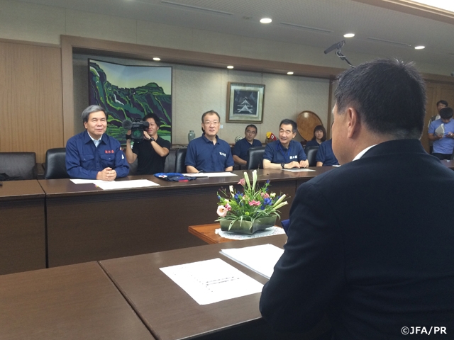 私たちサッカー界が、何をすることが出来るかをサッカーファミリー全体で考え、代表選手・監督・スタッフ・ファン・サポーター・試合に来場してくださった方々など、本当に多くの皆さまから様々な形で集められた義援金を本日お届けに参りました。熊本の復興のために是非有効に活用して頂ければと思います。また今回の義援金だけではなく、様々なプロジェクトを通じて地域の子供達が更に明るい笑顔になってもらえるように、今後も尚一層の支援を続けていきたいと考えています。