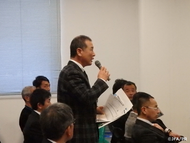 「4種リーグの日程問題」「指導者養成の現状」など、様々な声が挙がりました。また、永年地域指導に携わっている方からは「代表のためにもジュニア年代が大事。リーグ戦も良いが、他府県の強豪チームとの試合に出るというような刺激も大事。モチベーションのために少年の世界大会など企画しても良いのでは」という声もあがり、活発な意見交換が行われました。