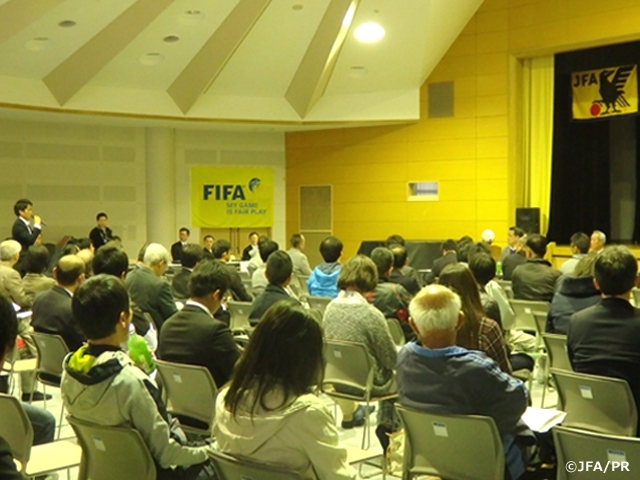 「サッカーファミリータウンミーティング」を3月18日(土)、佐賀県の小城市保健福祉センター(桜楽館)にて開催しました。選手、サポーター、指導者、審判員、保護者、クラブ関係者、自治体関係者など、約100人が参加しました。