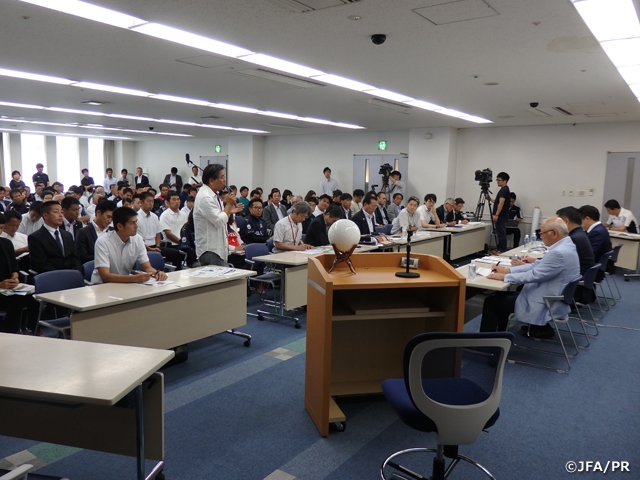 続いて「日本サッカーの発展に向けて ~サッカーファミリーの皆様とともに~」をテーマに、田嶋幸三JFA会長より参加者に向けプレゼンテーションが行われました。田嶋会長は、JFAの存在意義と責任、各種日本代表の最近の活動報告、今後JFAとして、女子の登録を増やし、男女との比率をドイツなみの7:3(男子:女子)を目指していくことや、指導面では実際の映像を見せながら球際やパススピードの強さを改めて強調していくこと、さらにグラスルーツや障がい者サッカーへの支援などに精力的に取り組んでいくことを出席者に説明しました。