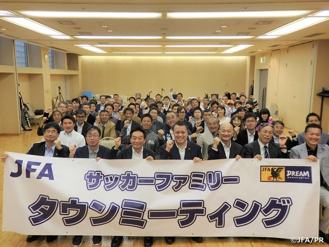 日本サッカー協会(JFA)と千葉県サッカー協会は10月16日(月)、千葉市内のホールでタウンミーティングを行いました。47都道府県サッカー協会と共同で開催しているこのタウンミーティング。あいにくの雨にもかかわらず、自治体や郡市サッカー協会の関係者、指導者・審判員、Jクラブのサポーターなどを約70人が参加しました。