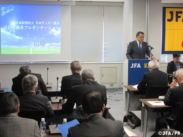 会長予定者については同選出管理委員会の大仁邦彌委員長(JFA名誉会長)が説明に立ち、同委員会から告示された会長候補者が田嶋幸三現会長1名で、評議員7名以上の推薦も得ていることなどが報告されました。その後、田嶋氏がプレゼンテーションを行い、この2年間で見えた課題、今後、取り組むべき施策について説明しました。