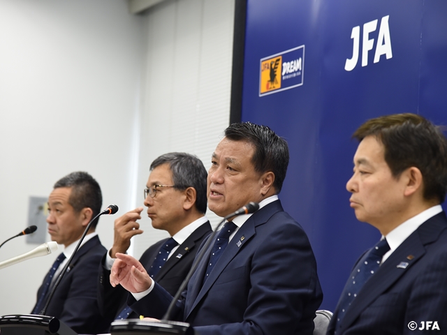 理事会後に就任会見が行われ、田嶋会長は、「この2年間、全力でやってきたが、もっとやるべきことが見えてきた」と語り、FIFAワールドカップでの上位進出はもちろん、2020年の東京オリンピックでの男女日本代表の躍進とそのレガシーを次の発展に生かすこと、登録数の減少を食い止めるための新たな登録制度の検討、女子サッカーの構造改革、新たなマーケティング戦略の立案など具体的な課題を挙げ、「新体制の下、理事の皆さんと日本サッカーの発展のためにまい進していく」と、2期目の抱負を述べました。