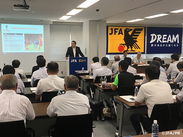 また、JFAの技術委員会からは関塚隆委員長が今回のFIFAワールドカップと今後についての報告を行ったほか、審判委員会から小川佳実審判委員長、女子委員会から今井純子女子委員長、国体実施委員会から植田昌利委員長、学校部活動検討委員会から池田洋二委員長が、都道府県サッカー協会において共に取り組んでもらいたい重点施策やそれらの中間報告などについて説明しました。