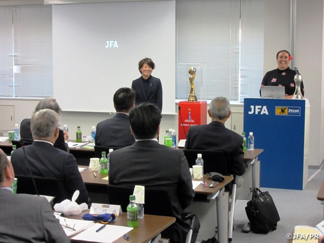 この日、FIFA女子ワールドカップトロフィーツアー(主催:国際サッカー連盟/FIFA)が日本サッカーミュージアムで行われたことから、評議員会でもトロフィーがお披露目され、チーフウィメンズオフィサーのサライ・バラマンさん(FIFA女子ワールドカップトロフィーツアースポークスパーソン)と元なでしこジャパンのキャプテンで、FIFAレジェントを務める宮間あやさんがあいさつに立ちました。