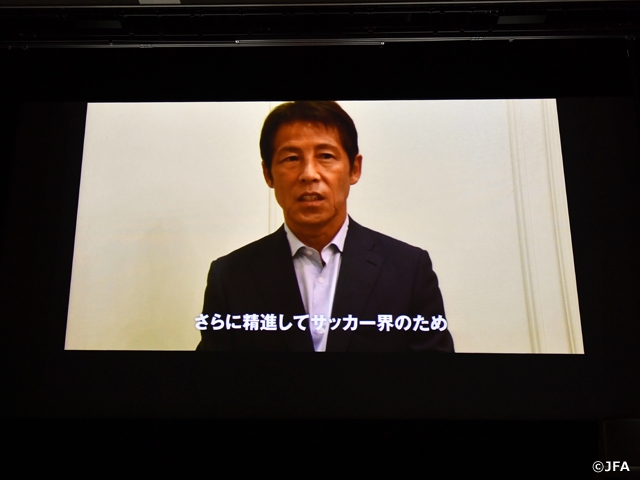 掲額式典には、岡田、佐々木両氏が出席。西野氏は、FIFAワールドカップカタール2022アジア2次予選のため出席できず、映像で喜びのメッセージを伝えました。