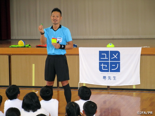 JFAこころのプロジェクト「夢の教室」で授業をするプロフェッショナルレフェリーの佐藤隆治さん。JFAの様々な活動は、参加者、スタッフ、観戦者の声とともにJFA公式ウェブサイトへ掲載し、積極的に情報発信している。