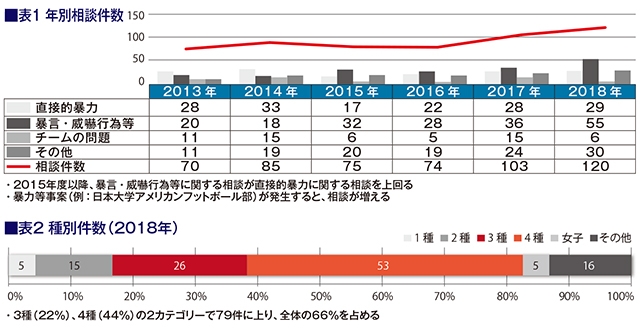 2013年6月、JFAはサッカーの活動現場における暴力行為や暴言の根絶を目指し、これらの行為の早期発見と是正および再発を防止するために、暴力等根絶相談窓口を設置した。相談窓口の認知度が高まり、また昨今のスポーツ界における不祥事を反映してか、2018年の相談件数は120件に上った(表1参照)。暴力等の事案がなくなっていないことは、非常に残念である。不退転の決意で撲滅に取り組まなければならない。