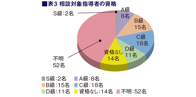 サッカーの活動現場が主な対象であるため、120件のうち68件(57%)が指導者に関する相談となっている(表3参照)。そのうち、指導者資格なしが14件(12%)であるが、B級、C級、D級コーチが44件(37%)。B級コーチといっても、そのほとんどが3種や4種のチームの面倒を見ている指導者である。