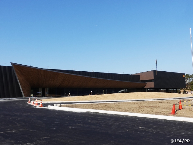 公益財団法人日本サッカー協会が千葉県千葉市の県立幕張海浜公園内に建設中の「高円宮記念JFA夢フィールド」は、4月のオープンに向け最終の準備を進めています。現在、クラブハウス、フットサルアリーナの建物の外観は完成に近づいており、天然芝・人工芝ともに一面の緑が広がっています。工事用の囲いも順次撤去されており、現地を訪れるとクラブハウス、フットサルアリーナやピッチが、向かいの大通りからも見えるようになりました。