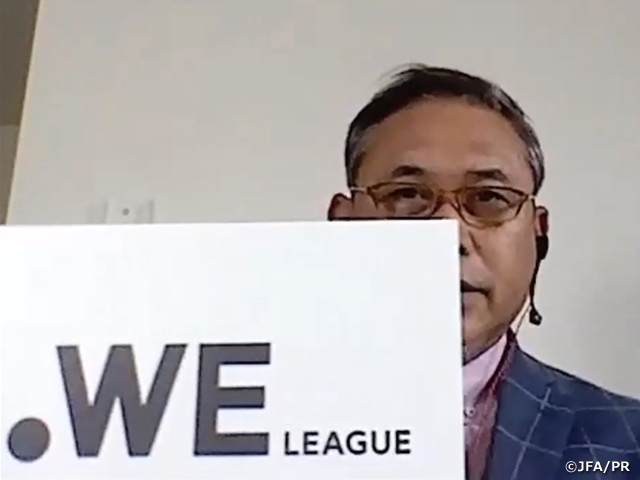 女子新リーグ設立準備室長の佐々木則夫氏は新リーグ名「WEリーグ」のパネルを手に、「WEリーグはWomen Empowermentリーグです。『女子サッカー・スポーツを通じて、夢や生き方の多様性にあふれ、一人ひとりが輝く社会の実現・発展に貢献する』という理念を掲げ、WEリーグの誕生によってこれまでなかった“女子プロサッカー選手”という職業が確立され、リーグを核に関わるわたしたちみんな(WE)が主人公として活躍する社会を目指す、という思いを込めました」と話しました。参入基準においても役職員の50%以上を女性とすることが示されるなど、まさに女性活躍を体現するリーグを目指しています。