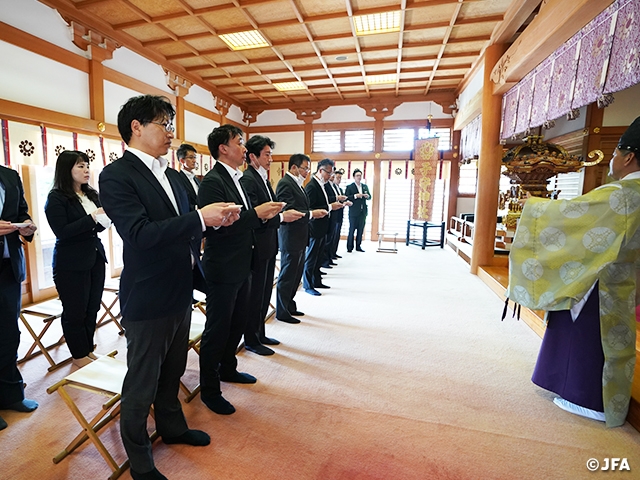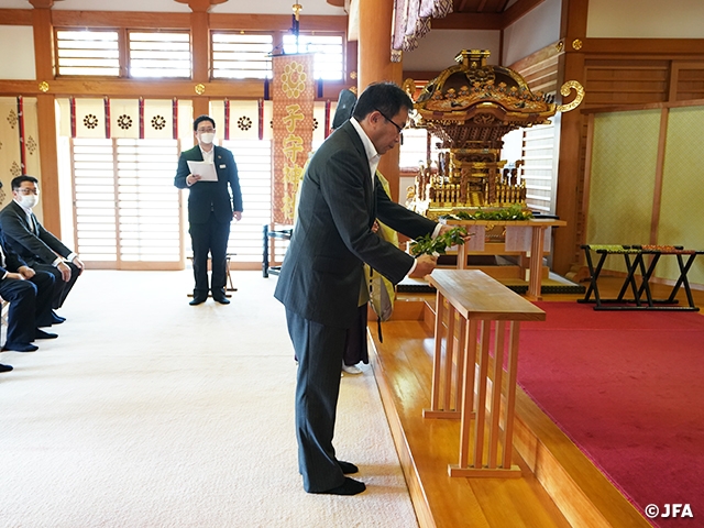 JFA夢フィールドは当初4月上旬に開所し、サッカーファミリーの皆さまにご利用いただく予定でしたが、新型コロナウイルスの影響を考慮し、6月を迎えた現在も閉館しています。しかしながら、利用開始に向けた準備を進める中で数名の職員が出社をしている状況もあり、本来なら建設に携わった皆さま、地元の皆さまをお招きして開所式で行う予定でしたが、今回は最小限の人数にて竣工神事を執り行い、利用開始の準備をすすめることといたしました。