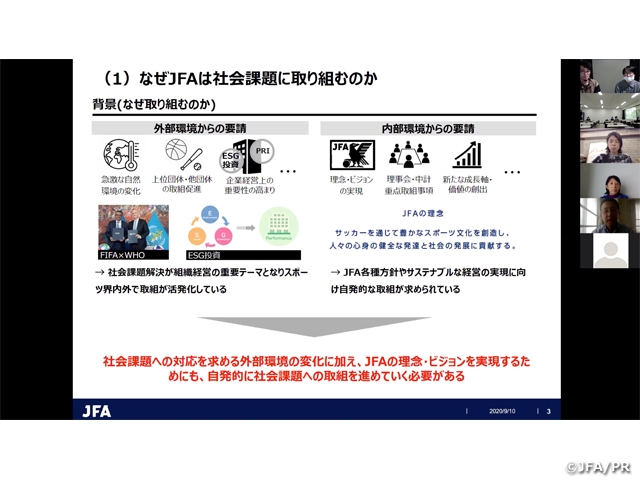 10月にスタートした後期の授業では、前期に学んだ内容を駆使して、今年オープンしたJFA夢フィールドをモチーフにした映像制作に着手。 第一回目には、同大・美術学部長でJFAの理事・社会貢献委員長を務める日比野克彦氏の挨拶のあと、田嶋会長よりJFAが社会貢献活動に取り組む意義や夢フィールドの設立理念などの説明がありました。その後、JFAが取り組むSDGsの活動について、JFA藤川人事部長より具体的な説明がなされました。