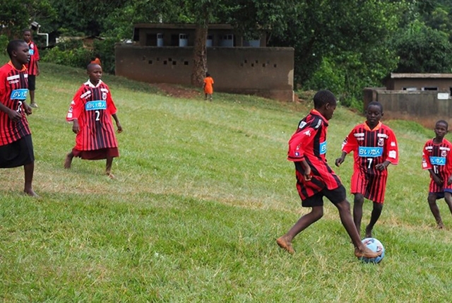 北海道コンサドーレ札幌のホームゲーム時に収集したサッカー用品にてサッカーを楽しむウガンダの子どもたち