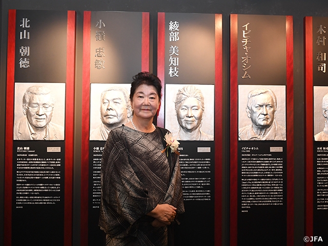 綾部氏は長年の指導の功績が認められ、今年度の第18回日本サッカー殿堂に女性として初めて掲額されました。