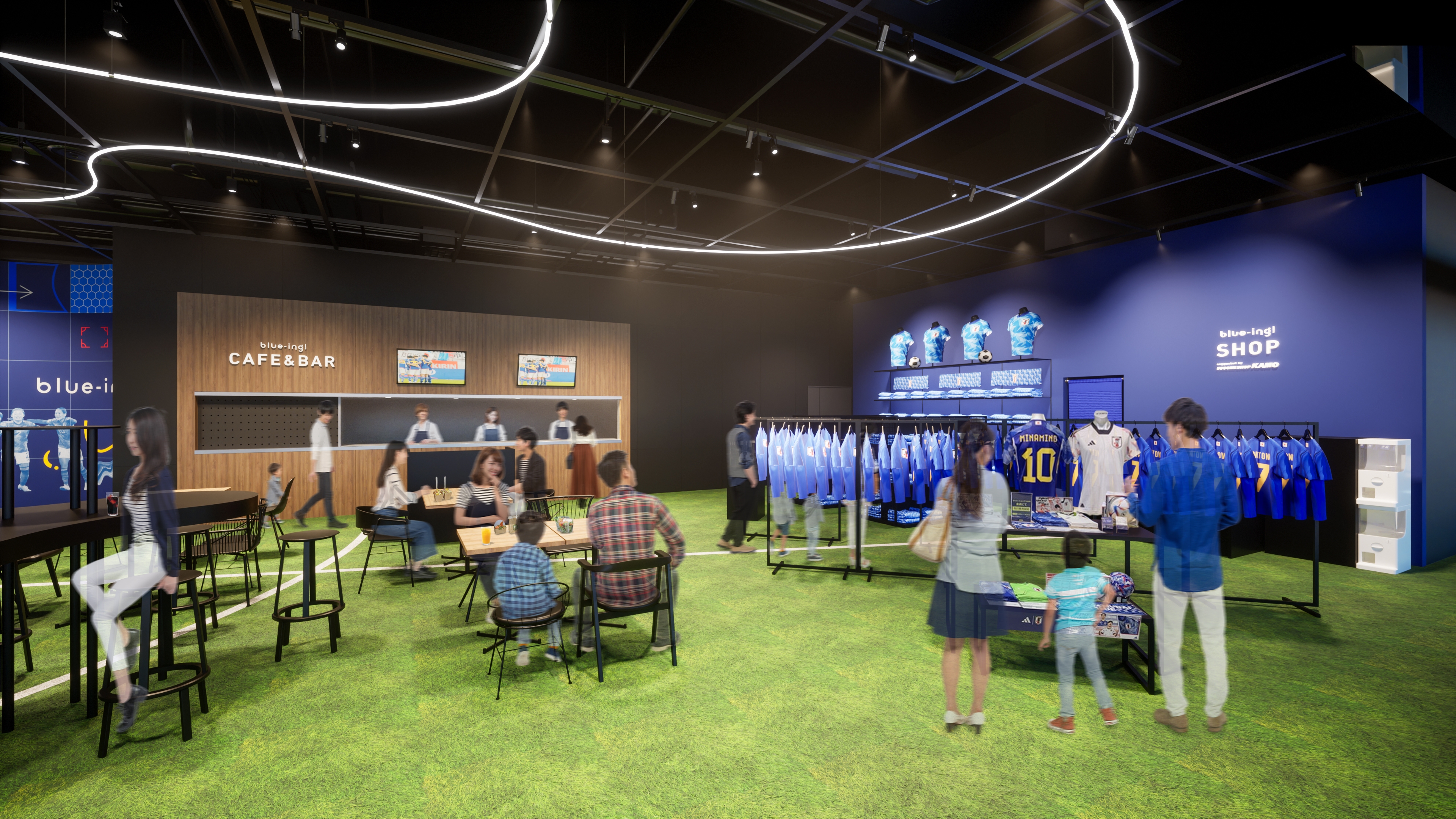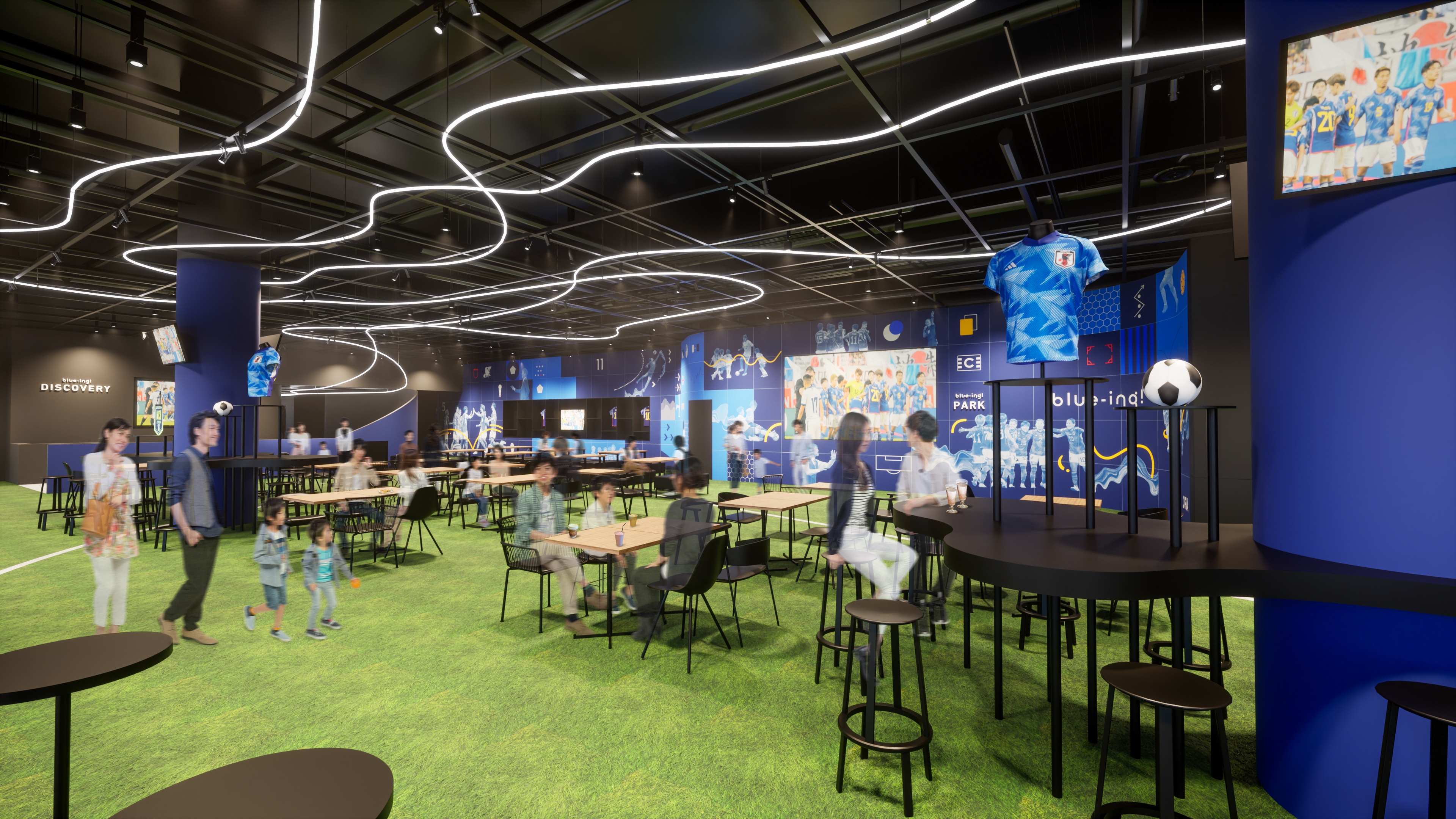 この度公開する3Dフロアマップとイメージ画像では、記念品の展示、カフェ&バー、サッカーショップが並ぶ「PARKエリア」と、生成AIなど最先端のデジタル体験ができる「DISCOVERYエリア」の二つのエリアの様子を見ることができます。フロアマップでは「PARKエリア」を3Dムービーで再現。サッカーのピッチを模した人工芝生のフロアや、“青(blue)”をテーマカラーとしたサッカーのモチーフ、迫力の瞬間を切り取った壁面ビジュアル、大型ビジョンに映し出される日本代表戦など、さまざまな疑似体験を楽しむことができます。また、blue-ing!独自のメニューを堪能できるカフェ&バーのほか、オリジナルグッズや日本代表のグッズなどを販売するサッカーショップもご覧いただけます。