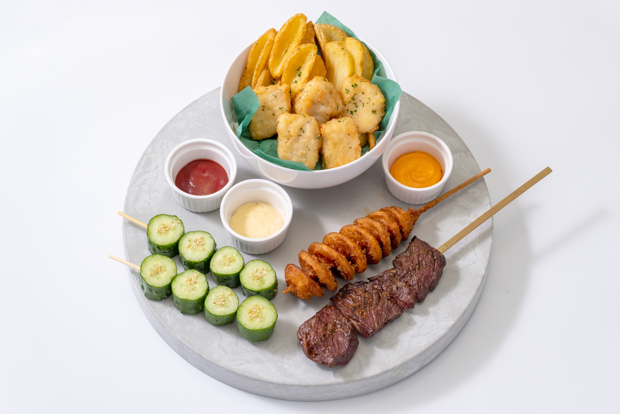 4バックきゅうり(左手前)、フィッシュアンドVチップス(中央後方)、ハリケーンポテト(中央)、牛カルビ串(右手前)