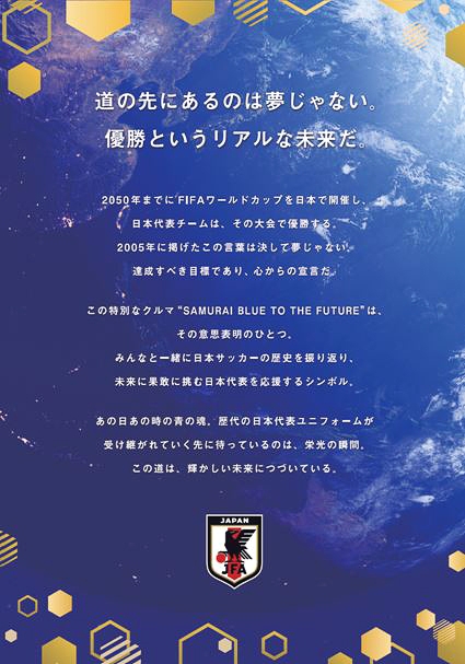 日本サッカー協会(以下、JFA)は、JFAナショナルチームパートナーのトヨタ自動車株式会社(以下、トヨタ)と連携し、“未来への挑戦”をテーマに、サッカー日本代表を応援する特別車「SAMURAI BLUE TO THE FUTURE」をリリースしました。
