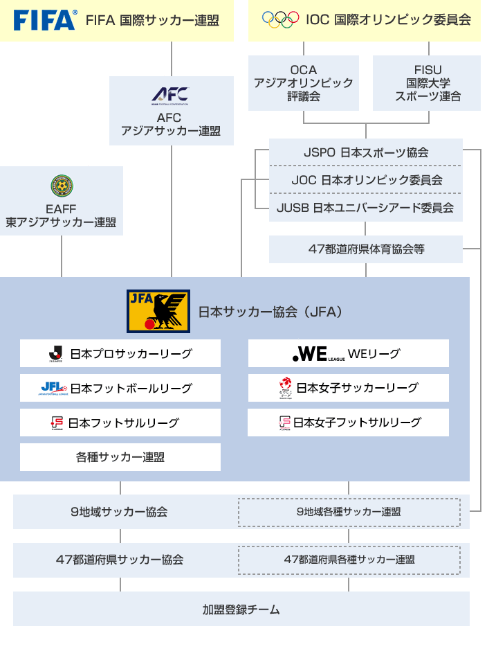 Jリーグを頂点としたピラミッド型のリーグ構造を形成し、各年代、各カテゴリーのチームが参加できる各種大会・リーグを整備しています。
