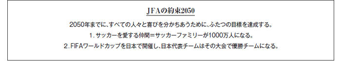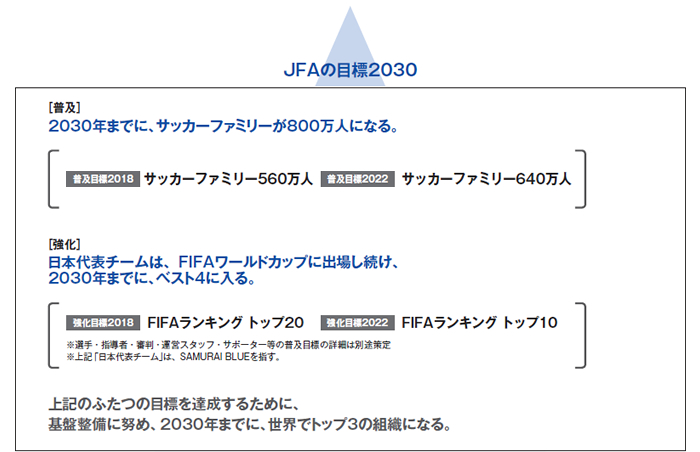 JFAは、「JFA2005年宣言」で掲げた「JFAの約束2050」の達成に向けて、2030年までに達成すべき新たな目標を設定しました。