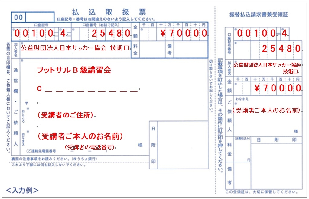 本講習会の受講が確定した方は、郵便局備え付けの「払込取扱票」に以下ご記入の上ご入金ください。