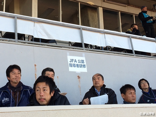 初の冬の鹿児島開催の大会に合わせて指導者研修を実施し、九州の方々を中心に18名の方に参加していただきました。準決勝の視察の前に行ったレクチャーでは、まず昨秋に行われたFIFA U-17ワールドカップの映像を見て、今大会に参加している子どもたちが5年後にこのレベルでプレーするにはどうすればよいかをイメージしていただきました。