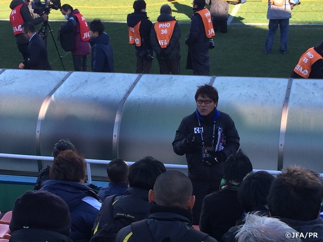 このリフレッシュ講習会は、毎年、高円宮杯U-15の決勝に合わせて開催され、今回は約100名の指導者が集まりました。日本のU-15年代のトップレベルの大会を視察し、現状の選手のレベルを把握・理解をすることを目的とし、またユース年代の指導者に関するレクチャーやディスカッションなどを通じて、指導者としてのレベルアップを図る内容となっています。味の素ナショナルトレーニングセンター大研修室で行われた講義では、2016EURO U-17のテクニカルスタディグループ(TSG)について映像を交えて報告しました。U-17年代の世界基準を映像で見て、サッカーの本質やテクニック、パススピードなど日本との違いを感じていただけたと思います。また、高円宮杯U-15の1回戦から準決勝までのTSG(成果と課題)を報告し、決勝戦(清水エスパルスジュニアユース対コンサドーレ札幌U-15)のピッチ上で闘っている目の前の選手の2年後を照らし合わせながら視察しました。この年代で、何が出来て、何が足りないか、世界に挑むために積み上げなければいけないものは何かを、それぞれが感じてくれたと思いますので、日常のトレーニングに活かしていただき、世界で活躍できる育成を期待したいと思います。年末の忙しい時期にもかかわらず、たくさんの方に参加いただき誠にありがとうございました。