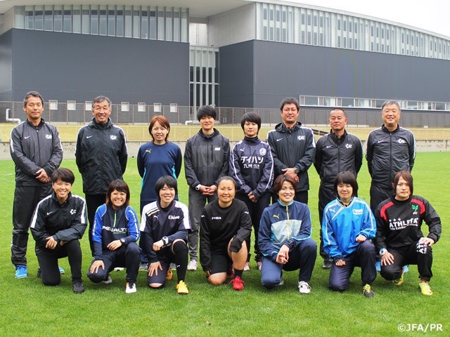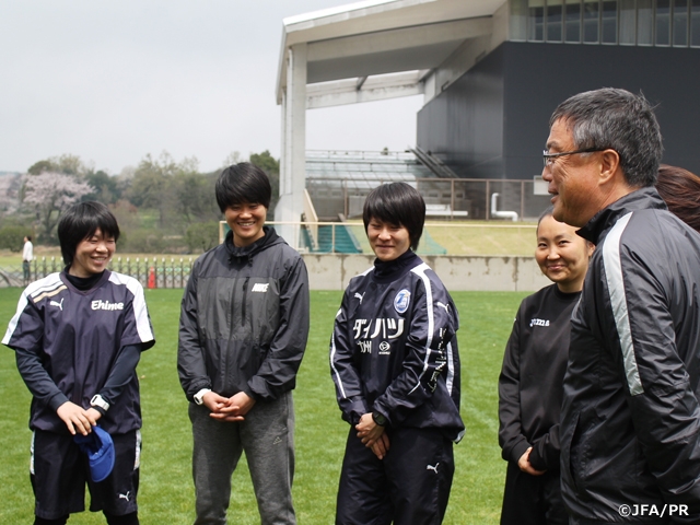 2017年度の第1回女性指導者スキルアップ研修会を、4月7日(金)から9日(日)にかけて熊本県で開催しました。本研修会はJFA公認指導者の上位ライセンス取得を目指す女性指導者を対象として昨年から開始したものです。今回は、なでしこジャパンの国際親善試合「キリンチャレンジカップ2017 ~熊本地震復興支援マッチ がんばるばい熊本~」に関連した「女子サッカーレガシープログラム in 熊本」の一環として位置づけられ、九州各県や海外から9名が参加しました。