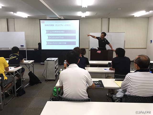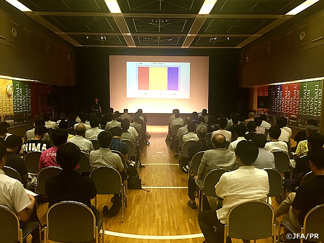 8月30日(水)に東京都文京区のJFAハウスで実施した研修会は、「AFC U-20フットサル選手権タイ2017報告」と題し、U-20フットサル日本代表の鈴木隆二監督が講師を務めました。約1時間半の講義にはサッカー・フットサルの指導者約80人が参加。鈴木監督は代表チームの成果と課題、攻守のプレーモデル、グループステージ第5戦のU-20フットサルイラク代表戦のゲームプランなどについて、実際に大会期間中のミーティングで選手たちが見た映像を用いながらレクチャーを行いました。