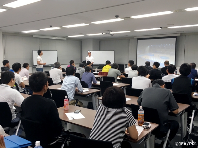 9月10日(日)に東京都文京区のJFAハウス、ならびに10月1日(日)に大阪府大阪市の大阪成蹊大学で実施された研修会では、「日本のフットサルにおけるGKの現状と課題」と題し、フットサル日本代表GKコーチの内山慶太郎氏(フウガドールすみだ)が講師を務めました。約1時間半の講義にはサッカー・フットサルの指導者計80人以上が参加。研修会の前半は、内山GKコーチから日本フットサルのGKの現状や背景、指導者が目指すべきGK指導などについて講義があり、後半はFリーグの映像を用いてGKのプレーを分析するグループワークが行われました。ほとんどがGKのプレー経験のない指導者でしたが、盛んなディスカッションが行われ、発表では多くの意見が共有されました。また、内山GKコーチ自身の見解も多く織り交ぜながらのフィードバックがあり、現場の指導に活きる知識や指導法を得ることができる内容となりました。