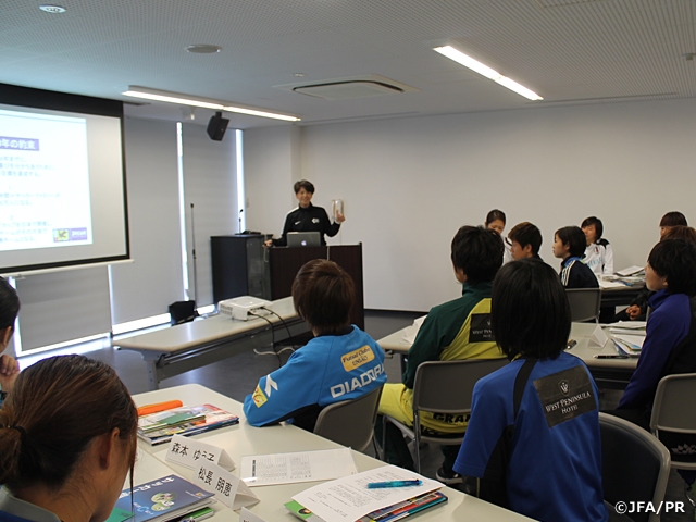 講習はC級コースの規定である技術・戦術、コーチング法、指導者の役割、発育発達等の12テーマの講義とピッチでの実技、指導実践を行った他、JFAアカデミー堺の見学や、AFC女子U-16選手権、AFC女子U-19選手権のテクニカルスタディグループの報告を受講するなど、とても多くのことを学ぶ時間となりました。また、「C級コーチ養成講習会を受講するにあたって」というテーマで1人5分間のスピーチも行いました。受講生がお互い、それぞれのバックグラウンドを知るとともに、人前で的確に話を伝える有効な実習となりました。JFAは女性指導者の拡充のため、女性を対象とした指導者講習会を来年も開催していく予定です。