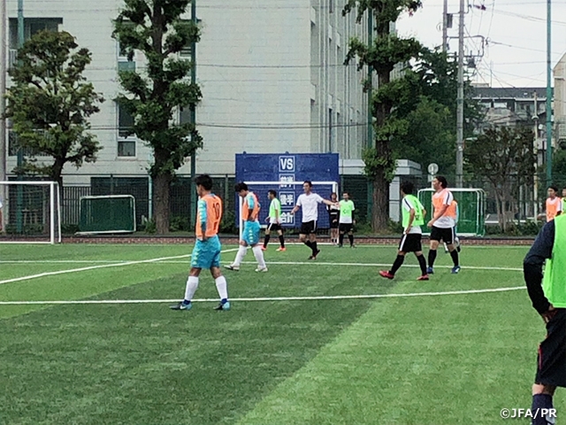 日本サッカーの発展のために我々がどう関わって行くのか改めて考えさせられ身の引き締まる思いでした。翌日からは午前中指導実践、午後は講義というスケジュールで進行。指導実践ではテーマに沿って、監督、コーチ、GKコーチ、フィジカルコーチが1つのグループを組み、1日、2グループが指導実践に臨みました。受講生それぞれが良く考え実践に臨んでいたため、充実した実践とディスカッションが行われました。ディスカッションでは活発な意見が交わされ、それぞれが多くの学びと気づきを得ることができたと思います。また、サポートプレーヤーとして、三菱養和のスタッフ、江戸川大学の学生にご協力頂きました。