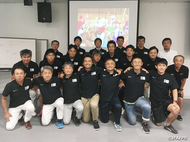 この研修会は「小学校の体育でのサッカー実施をサポートする小学校体育サポートインストラクターの養成」、「既存の小学校体育サポートインストラクターの研修」を目的に実施している研修会で、各FAから19名の方が参加しました。