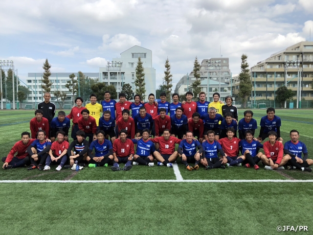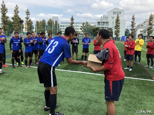 18日(木)、中期最終日午前中は、毎年恒例の三菱養和SCスタッフ 対 S級受講生による30分ハーフの真剣勝負を行いました。前半から受講生チームが主導権を握りますが、養和スタッフも集中力を切らさず、緊張感ある展開が続きました。後半受講生チームは一瞬の隙を突かれPKを返上し先制点を奪われますが、試合終盤、永井秀樹が同点ゴールを決め、白熱したゲームは1-1でタイムアップ。今年も記憶に残る名勝負を繰り広げました。