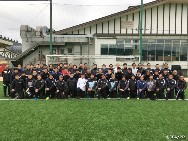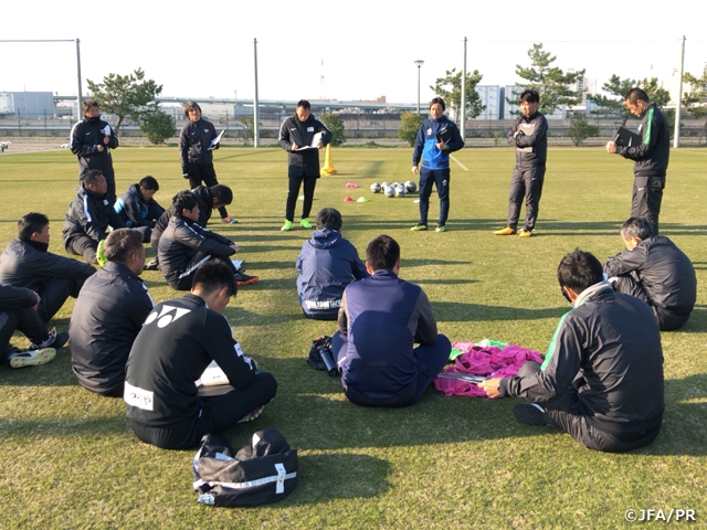 B級コーチ養成講習会に向けた研修会を東西2会場に分け、東は時之栖、西はJ-GREEN堺にて実施しました。今年度はJFA・FAと合わせて53コースが開催予定であり、約100名のインストラクターが集まりました。2018年はロシアワールドカップでの日本代表の活躍があり、また今年はU-17・U-20のワールドカップが開催されます。育成年代の日本代表もそろって出場し、活躍が期待されています。その中で、改めて日本の目指す方向性を共有し、講習会の指導方針を確認するなど充実した研修会となりました。都道府県FAインストラクターの皆さんは、日常から研さんを積んでいる指導実践や受講者から意見を引き出すファシリテーターとしてのスキル習得に積極的に取り組んでいました。これから開始する各コースの受講生の皆様には、質の高い・オープンマインドなコースを受講していただけると思います。