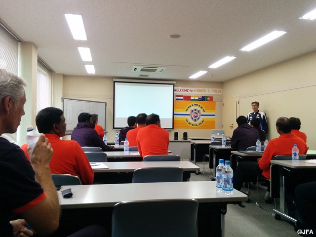 研修期間中、セレッソ大阪と清水エスパルスの2クラブに協力頂き、受講者たちはトップチームが行うトレーニングを視察しました。練習後、両クラブ監督には受講者からトレーニングの内容や目的、日本での指導について多くの質問がよせられました。また日本人の補助学生プレイヤーを相手に指導の実技講習を行いました。
