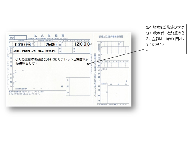 [指導者]⇒ ログイン ⇒[リフレッシュ研修会申込み/確認]⇒[主催・その他]⇒[JFA]⇒[JFA公認指導者研修2014ゴールキーパーコーチ リフレッシュ研修 東日本コース]