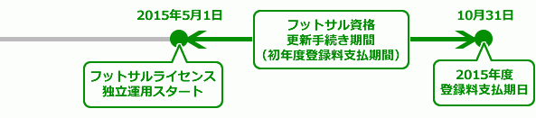 過去にフットサル資格を取得された方で、2015年4月以降、引き続きフットサル資格の維持を希望する方は、現在口座引き落としでお支払頂いているサッカー指導者の年間登録料とは別に、2015年4月3日~2015年10月31日までにフットサル資格登録料をお支払頂きます。期日までにお支払が確認できない場合、フットサル資格は失効となります。