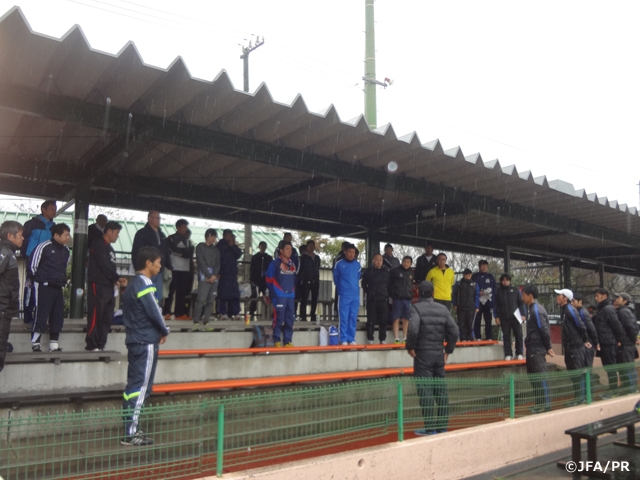 両日ともに雨模様の天候にも関わらず、受講生の皆さんは全力でプレーをしてくださいました。本リフレッシュ講習会は、JFAが目指すJAPAN’S WAYを具現化するために必要な「動きながらのテクニック」「動きながらのプレー」を中心に構成しました。講義では世界基準の映像とアカデミー生のプレーを見ていただき、実技ではパス&コントロールを基本に、崩しをテーマとして実際にプレーを体感。最後にアカデミージュニアユース年代のゲームを観戦していただきました。