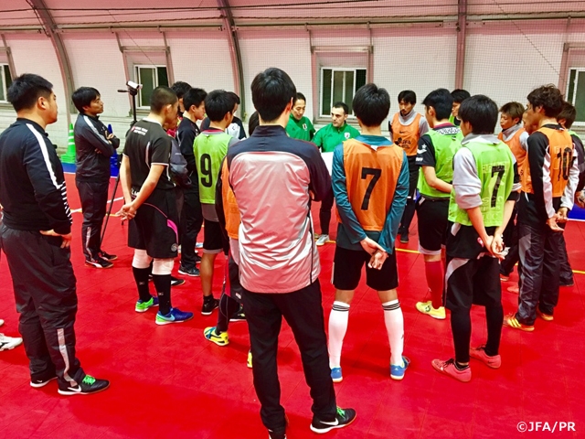 研修会は小西鉄平JFAフットサルテクニカルダイレクターと、ブルーノ・ガルシア フットサル日本代表監督が講師となり、講義と指導実践でフットサルA級のカリキュラムにおけるポイントを学びました。