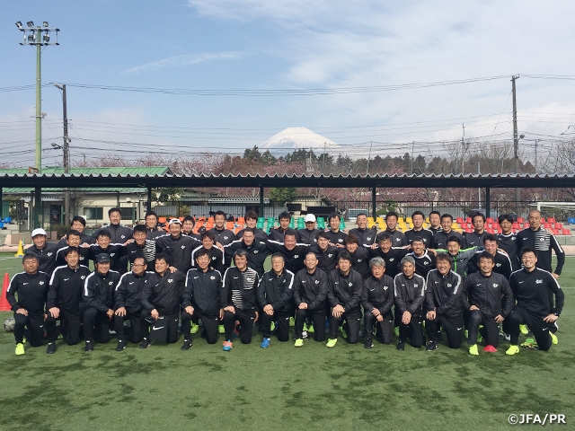 3月13日(火)~16日(金)の4日間、JFA トレセンコーチ研修会が静岡県御殿場市にて開催されました。本研修会は、全国各地で行う今年度のトレセン活動のメニューの確認やポイントの整理を目的に毎年実施されており、今回は選手育成と指導者養成・代表強化を担当するナショナルトレセンコーチ55名が参加しました。