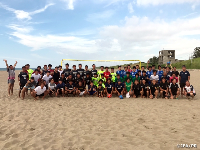 石川県白山市徳光海岸で7月28日(土)、JFAビーチサッカー巡回クリニックを実施しました。当初は全国ビーチサッカー大会北信越予選、ビーチスポーツフェスティバルである「CCZフェスティバル」、それぞれに合わせて2日間にわたってクリニックを行う予定でしたが、台風の影響でCCZフェスティバルが中止になり、28日(土)のみの開催となりました。
