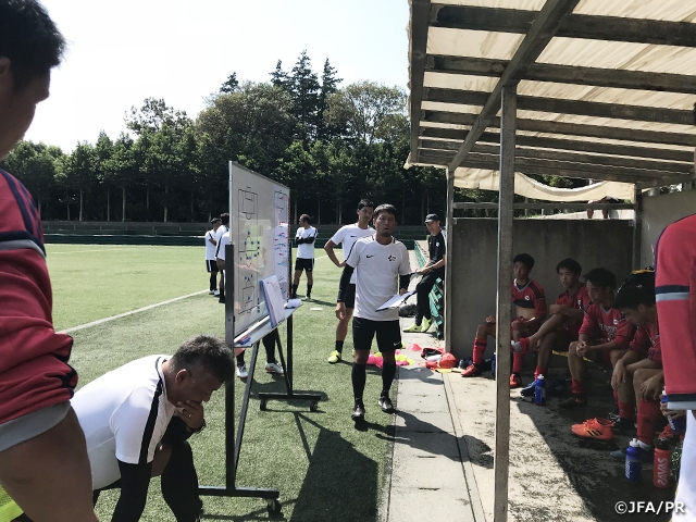 初日にサポートプレーヤーとして参加していただいている流通経済大学の選手を2チームに分け、実際のチームマネジメントに照らし合わせ、練習試合から2日間のトレーニングそして、練習試合というM-T-M(マッチ・トレーニング・マッチ)の4日間カリキュラムを行いました。