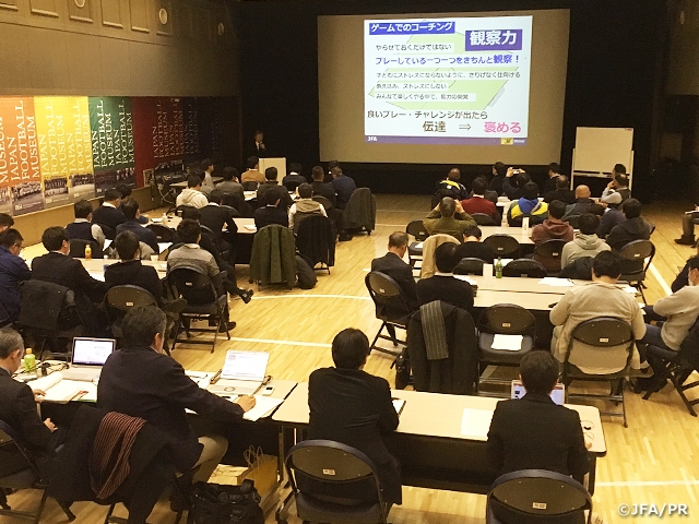 JFAからは、『原点回帰』 をキーワードに、そもそもサッカーって楽しいもの、その楽しさはゲームこそで味わえるものという心に立ち返ること、ゲーム環境の大切さを訴えました。フェスティバルとして47FAでは様々な形式で開催しており、その中心がゲームではあるが、もっともっと子ども達主体でストレスなくプレーできるような(ストリートサッカーのような)オーガナイズにし、子ども達の自由なプレーを見守りながら、良いチャレンジなどを具体的に声掛け(ほめる)をしていくことで、さらに楽しいを感じてもらえるようにしていくことが大切だと伝えました。