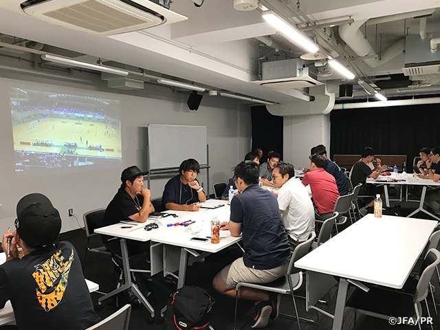 決勝戦観戦後は、受講者の方々がグループに分かれ両チームのGKについてそれぞれの成果と課題について、ディスカッションを行い、今後の改善に向けた指導方法などを内山 フットサル日本代表GKコーチと共にグループワークを行いました。